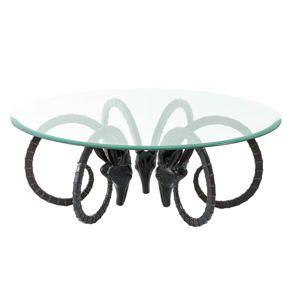 Мебель/Мебель для дома/Столики/Журнальные столики / Eichholtz / Журнальный столикЖурнальный столик Coffee Table Ibex оригинальным основанием из бронзы в виде голов козерога. Столешница выполнена из плотного прозрачного стекла